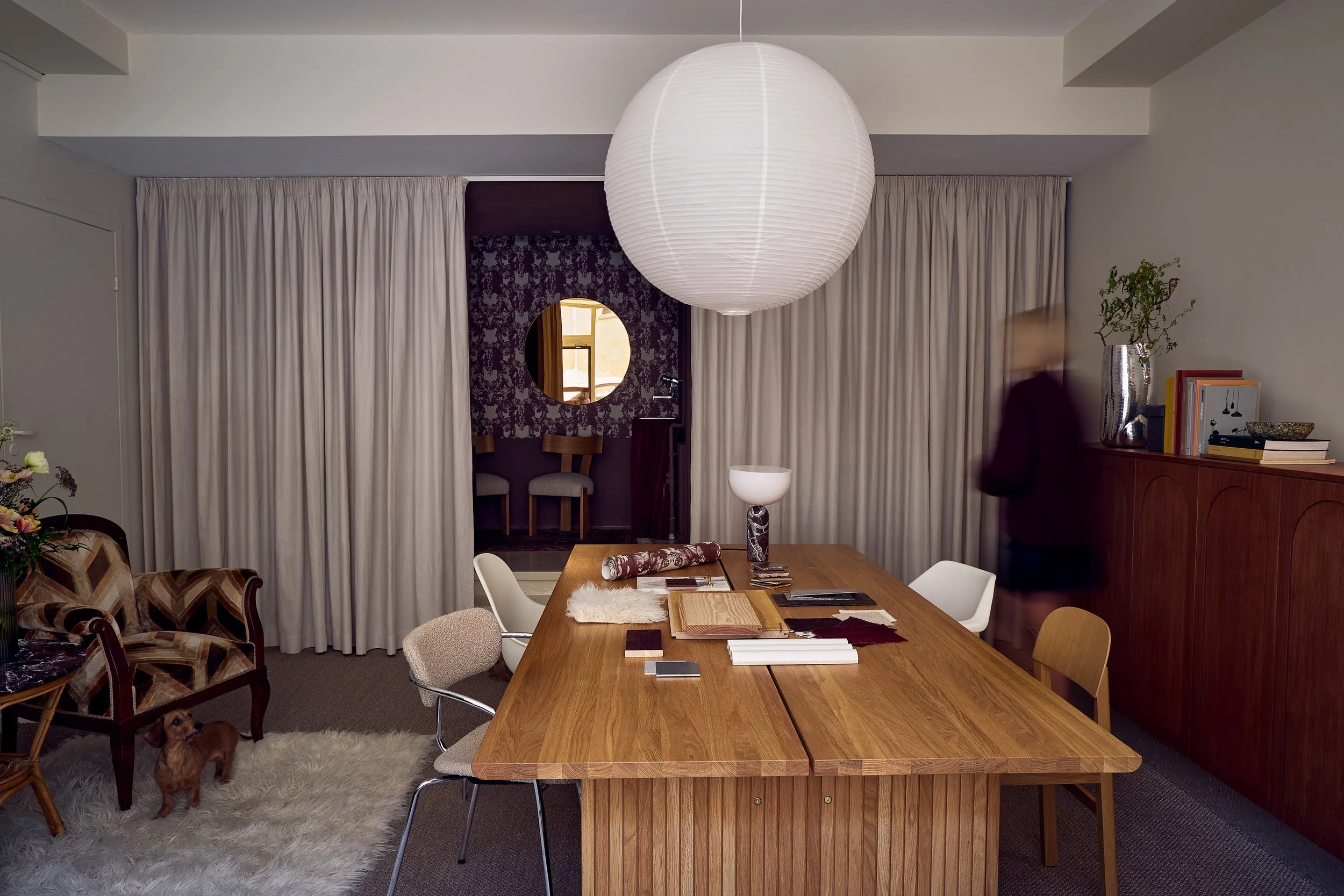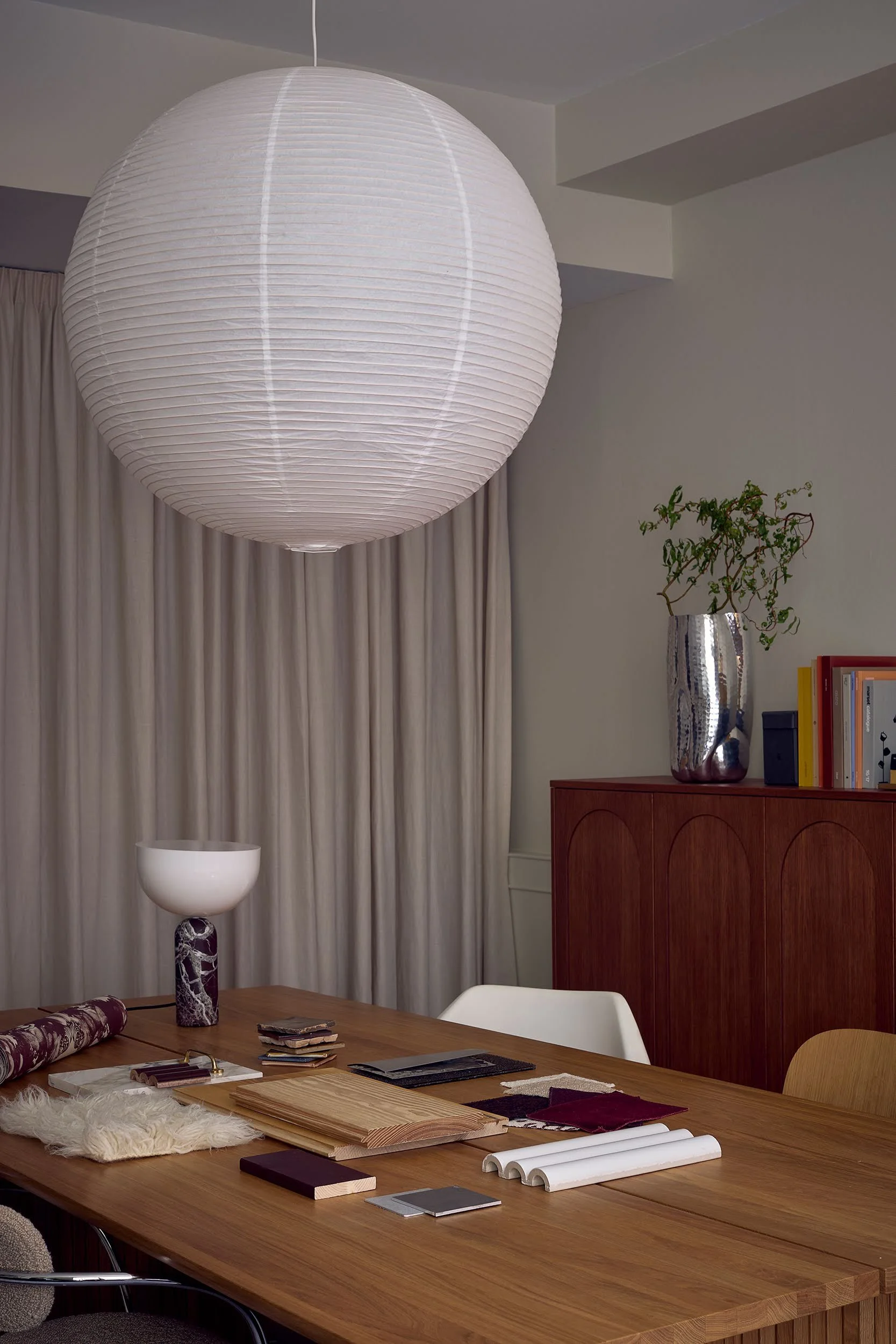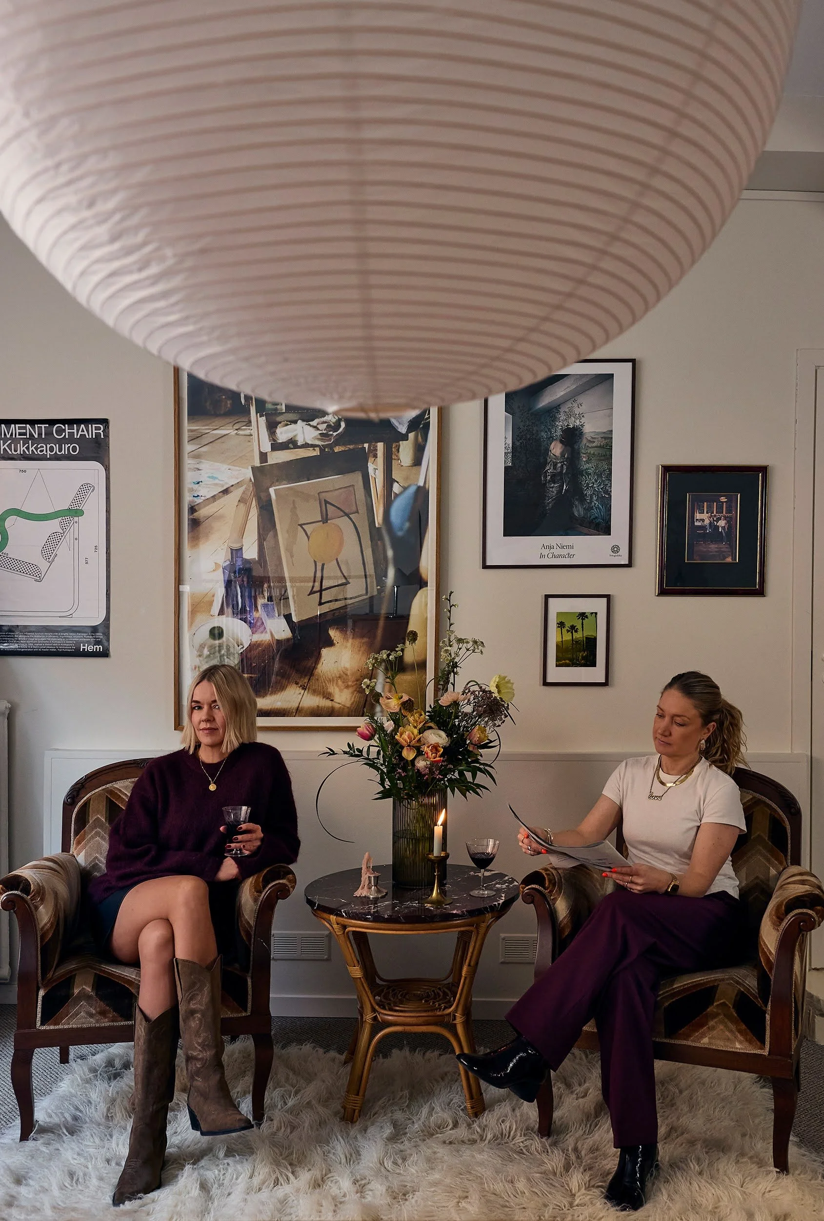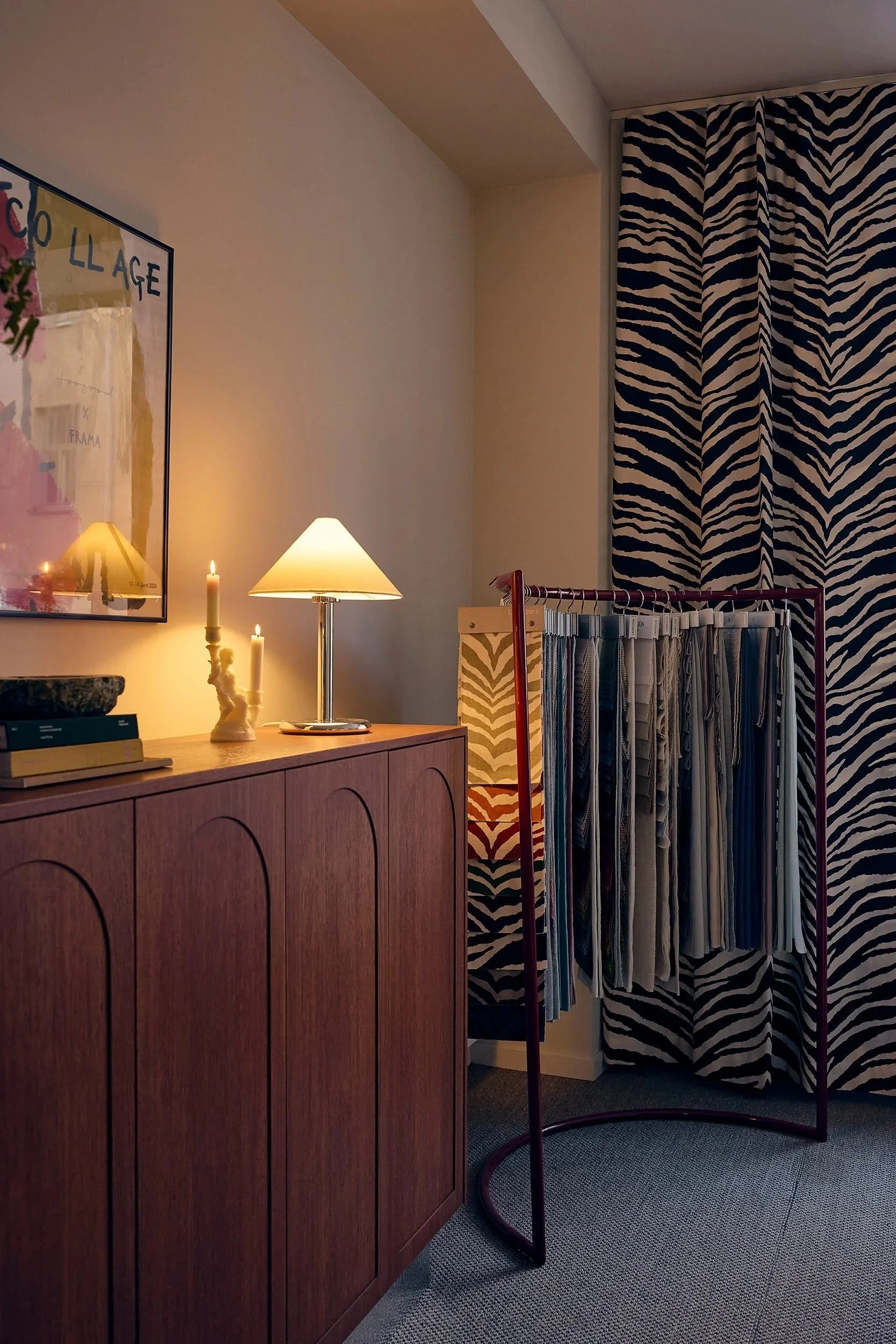 We wanted to create a welcoming, homelike environment for our clients and a cozy space for working. The atmosphere was created by combining vintage and bespoke furniture, bold wallpaper and wall art with a story.